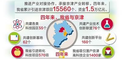 我省加強與中關村、濱海新區等創新源頭的對接協作,借力京津產業優勢和科技資源,構建協同創新共同體,加快推動產業轉型升級。數據顯示,近四年來,我省與京津共建各類科技園區55個、創新基地62個、創新平臺160個、產業技術創新聯盟76個,引進轉化科技項目570項,吸引落戶京津高科技企業1400家。