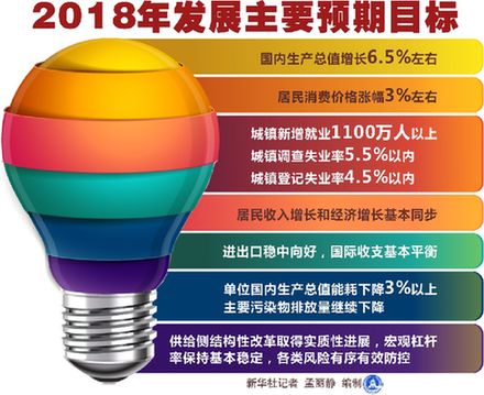 政府工作報告提出,今年發展主要預期目標是:國內生產總值增長6.5%左右;居民消費價格漲幅3%左右;城鎮新增就業1100萬人以上,城鎮調查失業率5.5%以內,城鎮登記失業率4.5%以內;居民收入增長和經濟增長基本同步;進出口穩中向好,國際收支基本平衡;單位國內生產總值能耗下降3%以上,主要污染物排放量繼續下降;供給側結構性改革取得實質性進展,宏觀杠桿率保持基本穩定,各類風險有序有效防控。