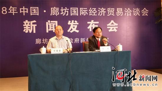 5月14日上午,2018年中國·廊坊國際經(jīng)濟(jì)貿(mào)易洽談會(huì)召開第二次新聞發(fā)布會(huì)。圖為會(huì)議現(xiàn)場。通訊員李松潔攝