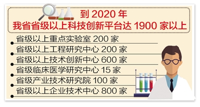 加速補齊基礎創新短板,方案提出,到2020年,我省省級以上科技創新平臺達1900家以上,其中省級以上重點實驗室200家、省級以上工程研究中心200家、省級以上技術創新中心600家、省級臨床醫學研究中心15家、省級產業技術研究院100家、省級以上企業技術中心800家。