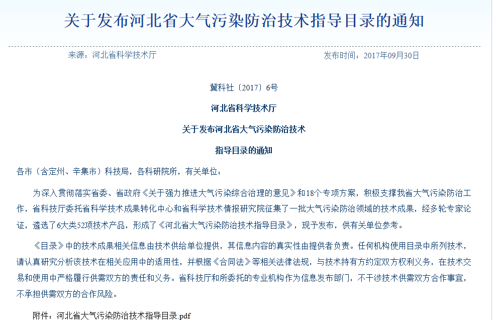 近日,河北省科學(xué)技術(shù)廳委托省科學(xué)技術(shù)成果轉(zhuǎn)化中心和省科學(xué)技術(shù)情報(bào)研究院征集了一批大氣污染防治領(lǐng)域的技術(shù)成果,經(jīng)多輪專(zhuān)家論證,遴選了6大類(lèi)52項(xiàng)技術(shù)產(chǎn)品,形成了《河北省大氣污染防治技術(shù)指導(dǎo)目錄》,園區(qū)企業(yè)河北唯沃環(huán)境工程科技有限公司榮幸入選。