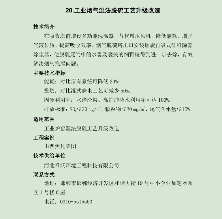 指導(dǎo)目錄中,唯沃入選的技術(shù)是“工業(yè)煙氣濕法脫硫工藝升級(jí)改造”,主要適用于工業(yè)爐窖濕法脫硫工藝升級(jí)改造,比原有系統(tǒng)降低20%的能耗,并且水淬渣粉、高爐沖渣水利用率可達(dá)100%,是科技治霾、精確治污的重要標(biāo)志性技術(shù)之一。